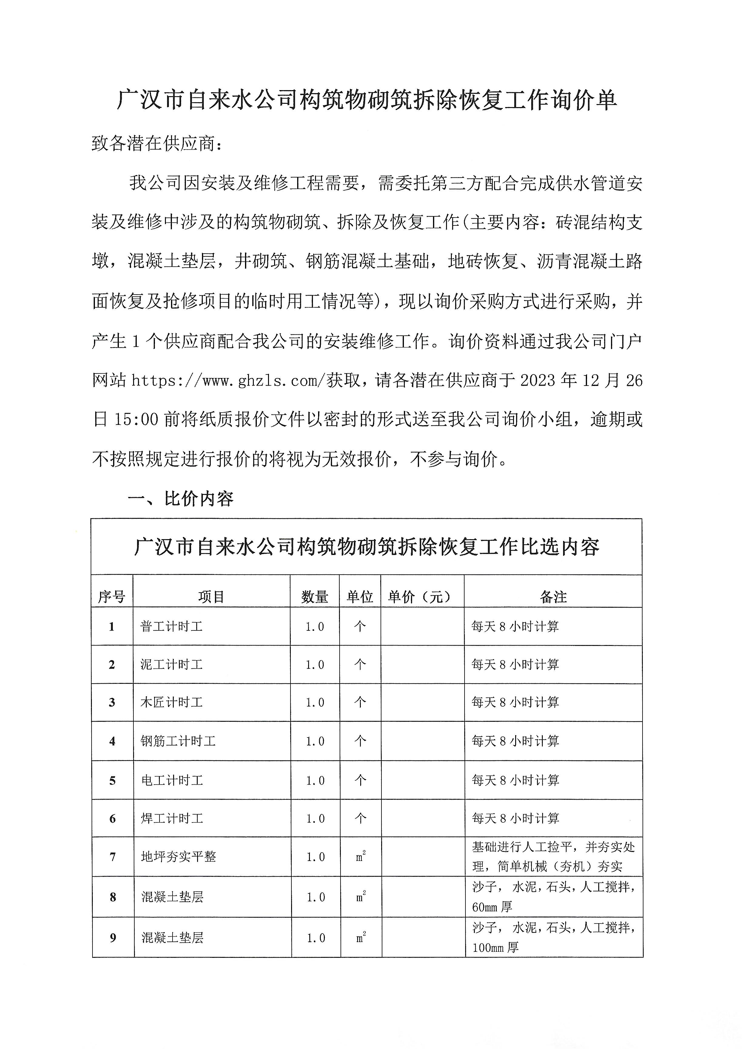 广汉市自来水公司构筑物砌筑拆除恢复工作询价单