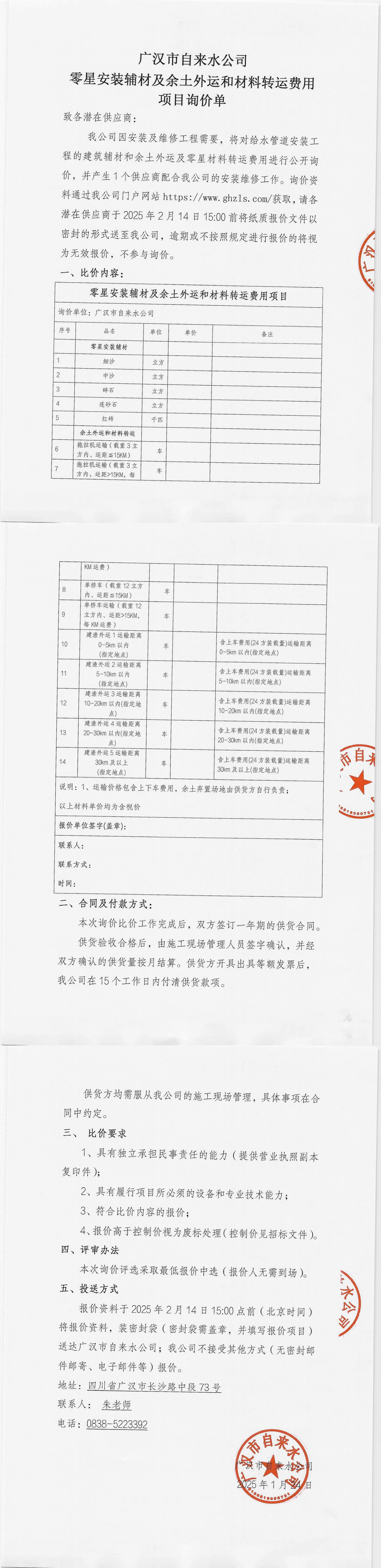 广汉市自来水公司零星安装辅材及余土外运和材料转运费用项目询价单