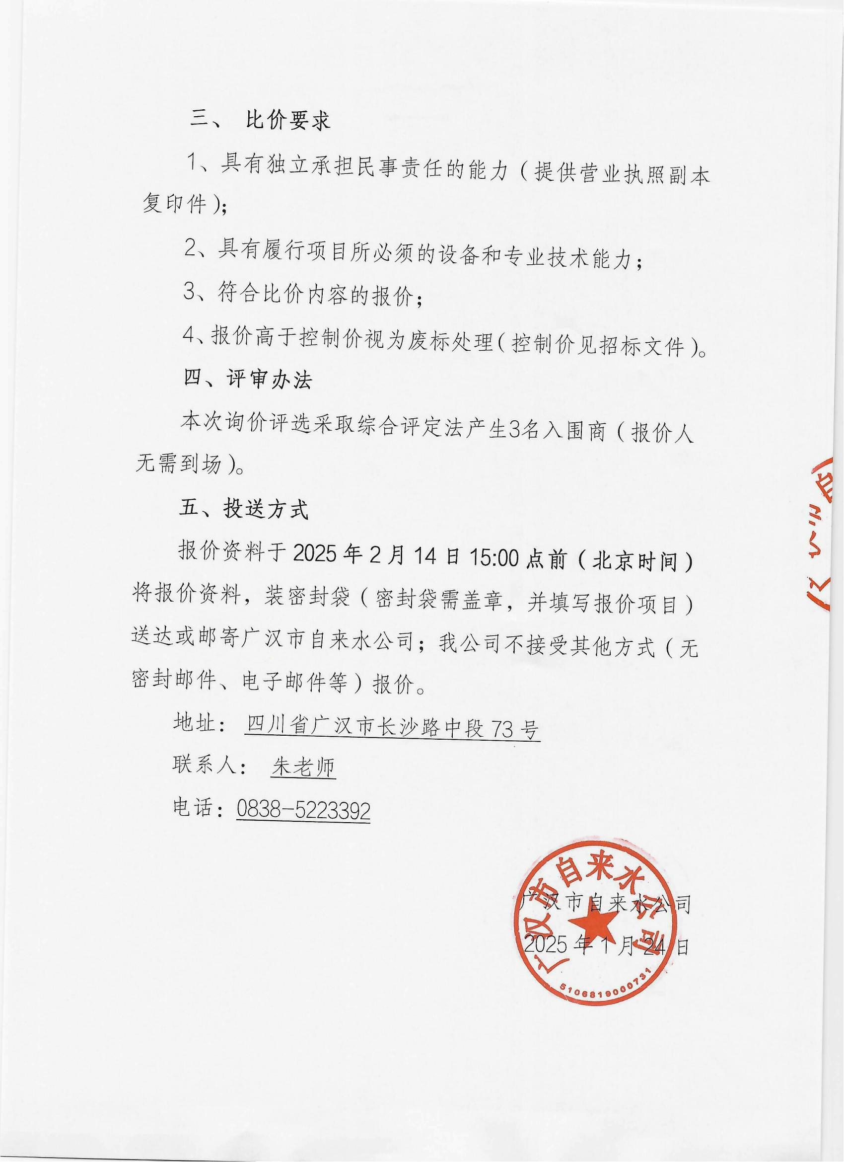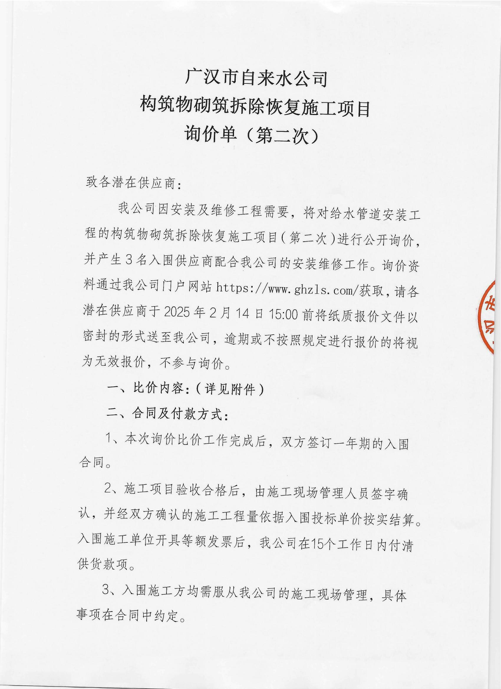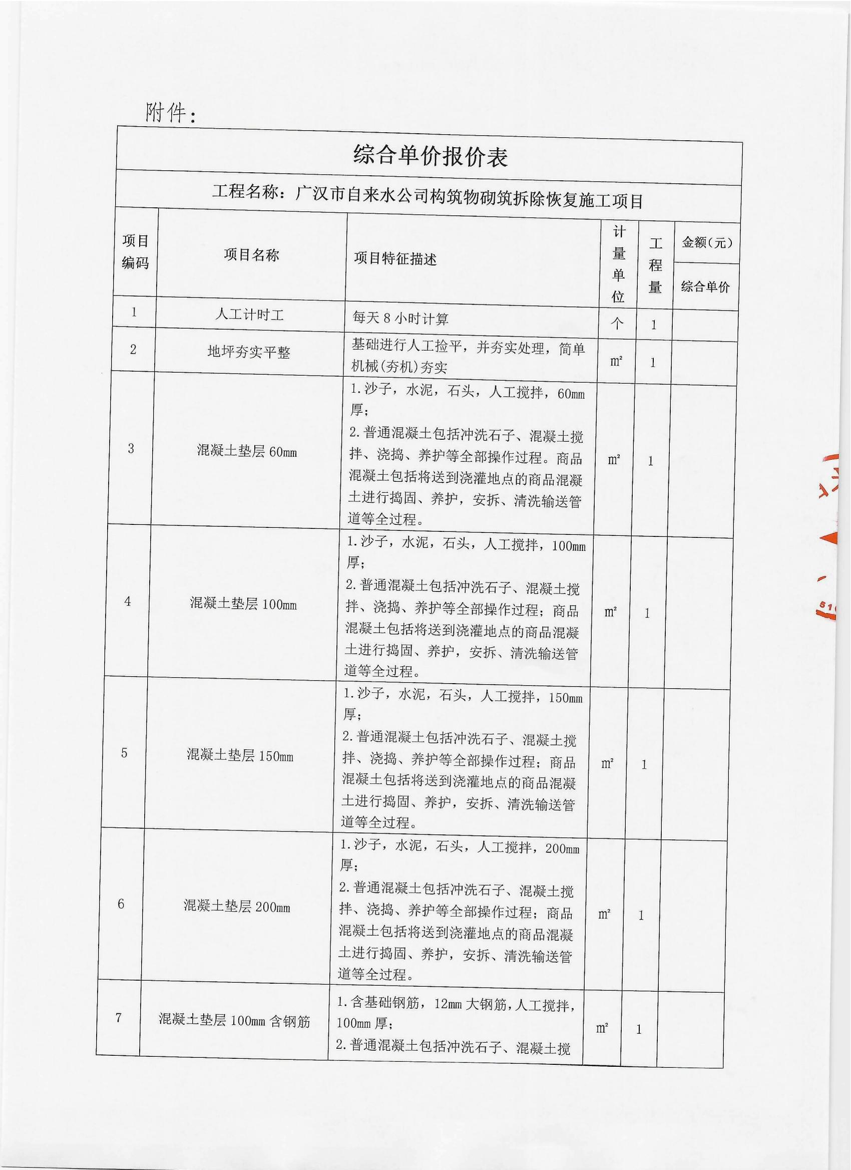 广汉市自来水公司构筑物砌筑拆除恢复施工项目询价单(第二次)