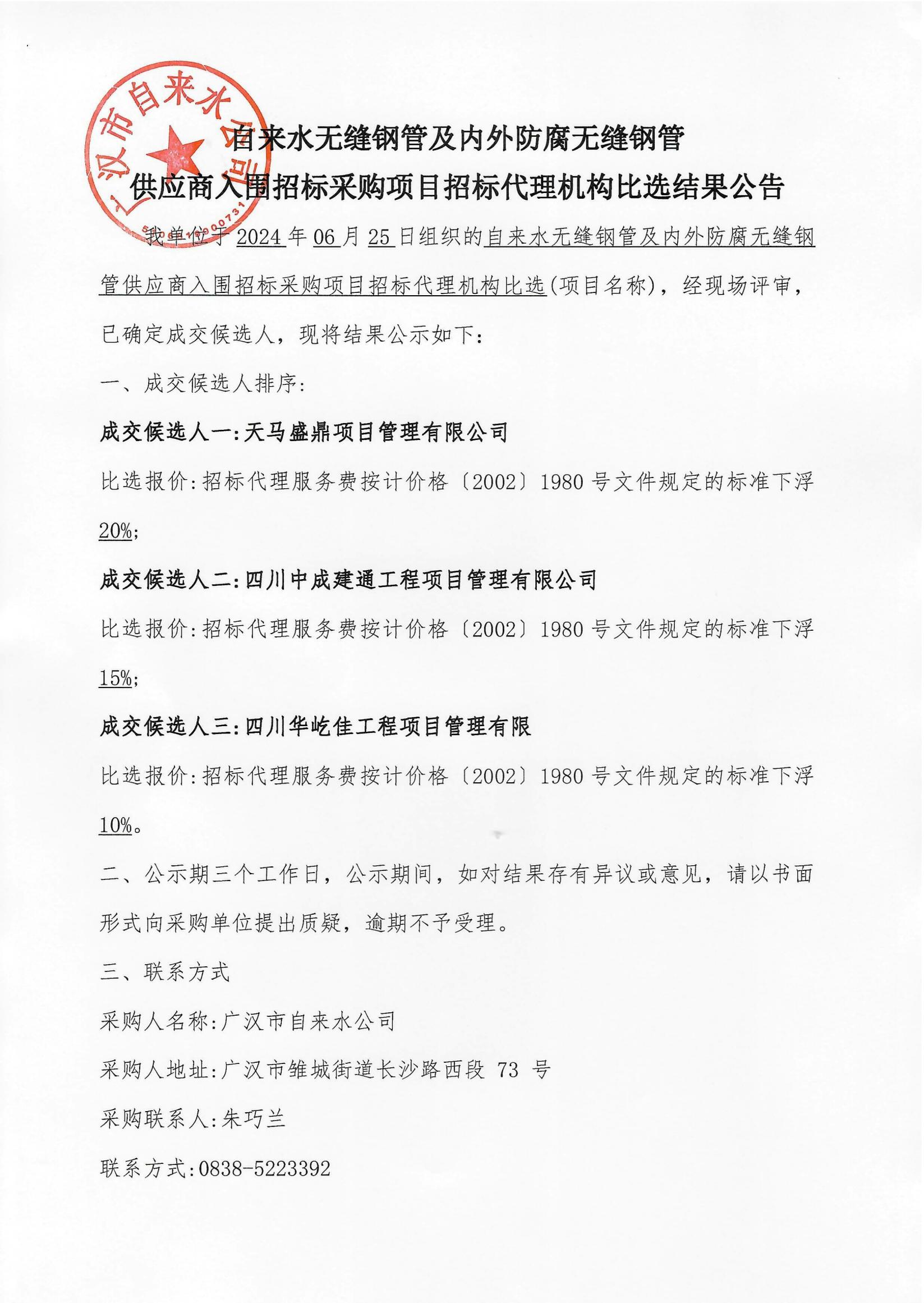 自来水无缝钢管及内外防腐无缝钢管供应商入围招标采购项目比选结果公告