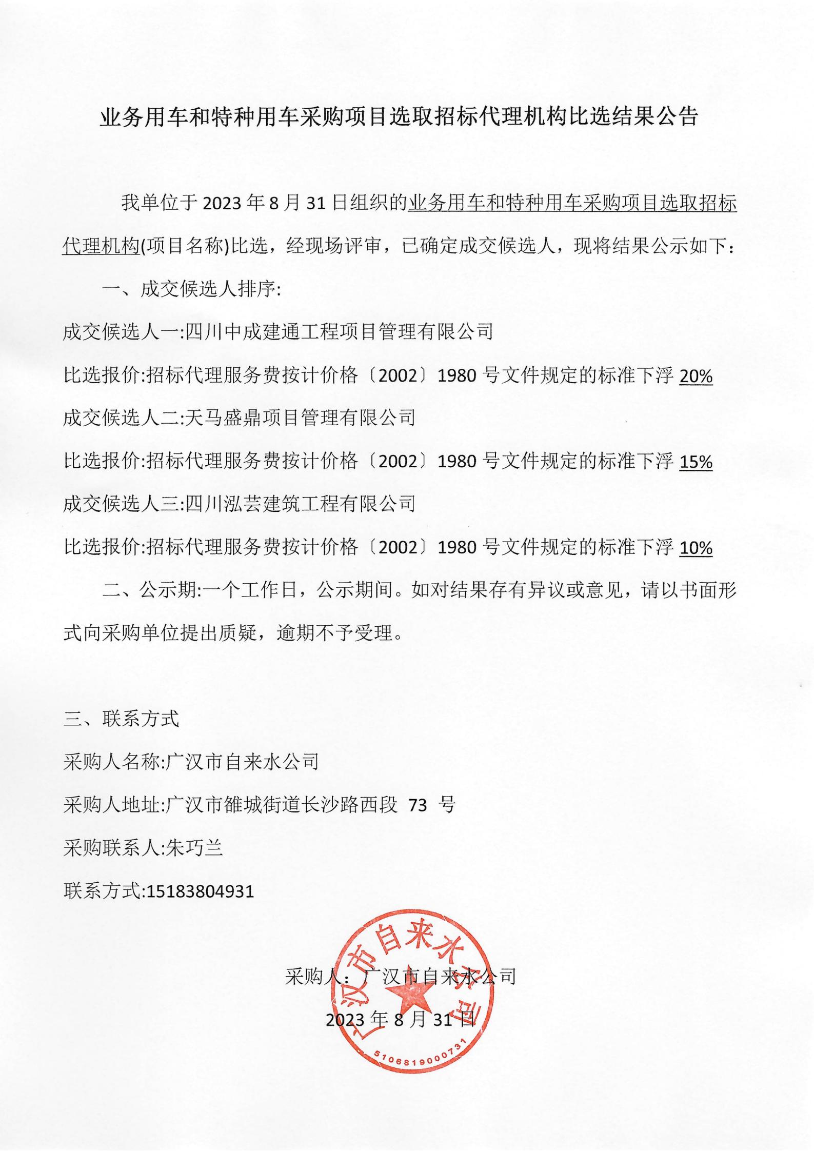业务用车和特种用车采购项目选取招标代理机构比选结果公告