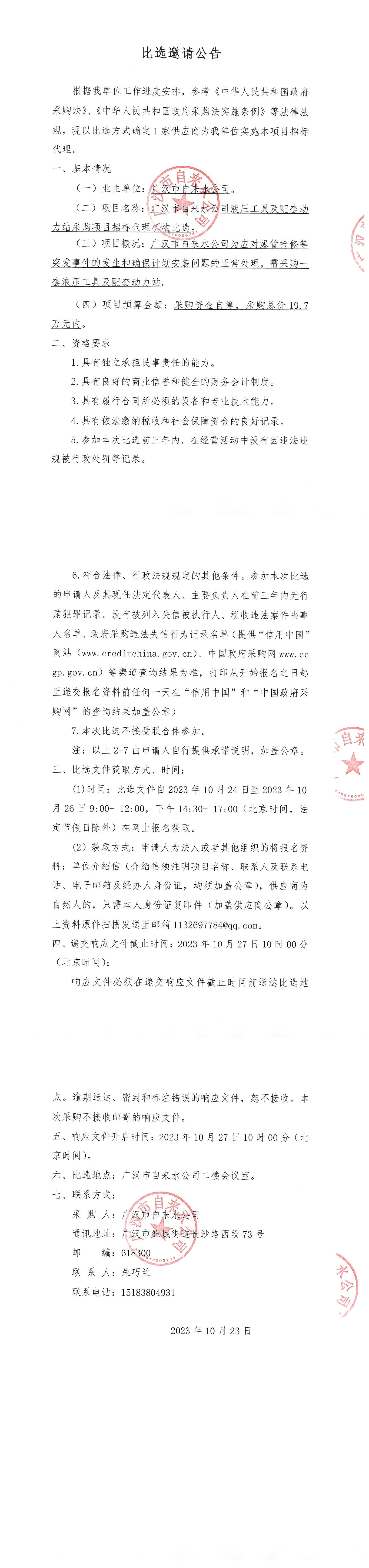 液压工具及配套动力站采购项目招标代理机构比选邀请公告