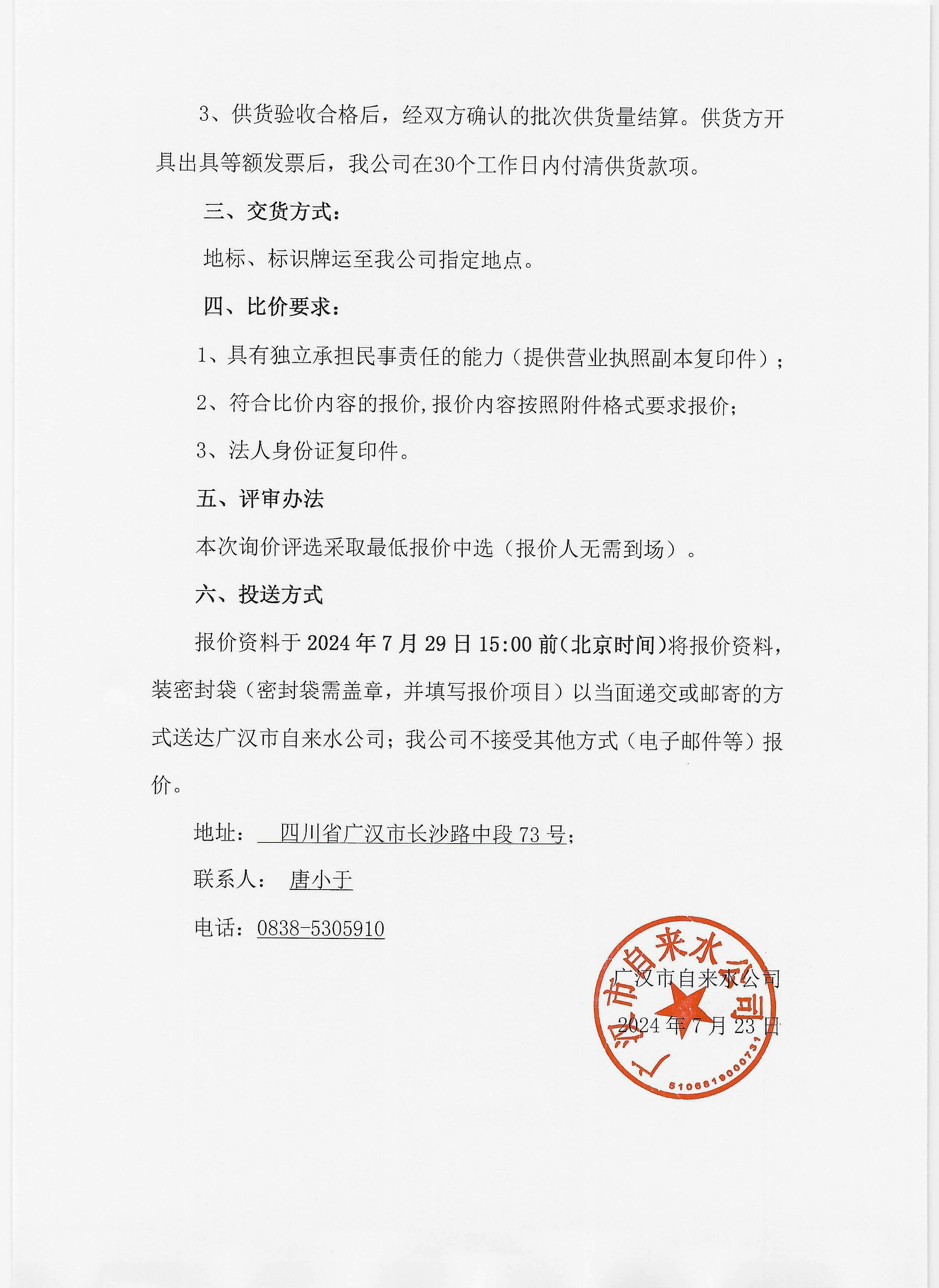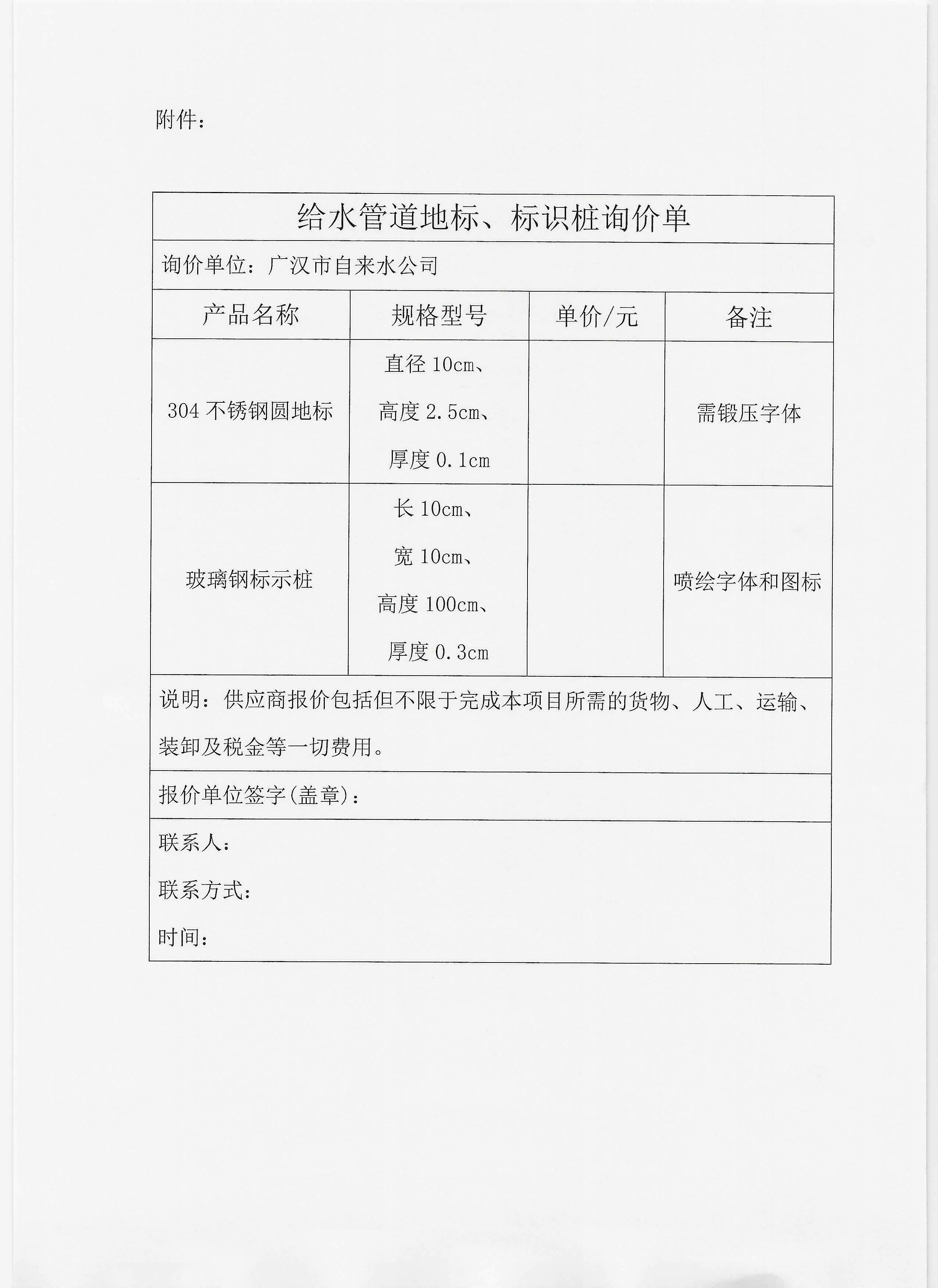 广汉市自来水公司关于给水管道地标、标识桩项目的询价函