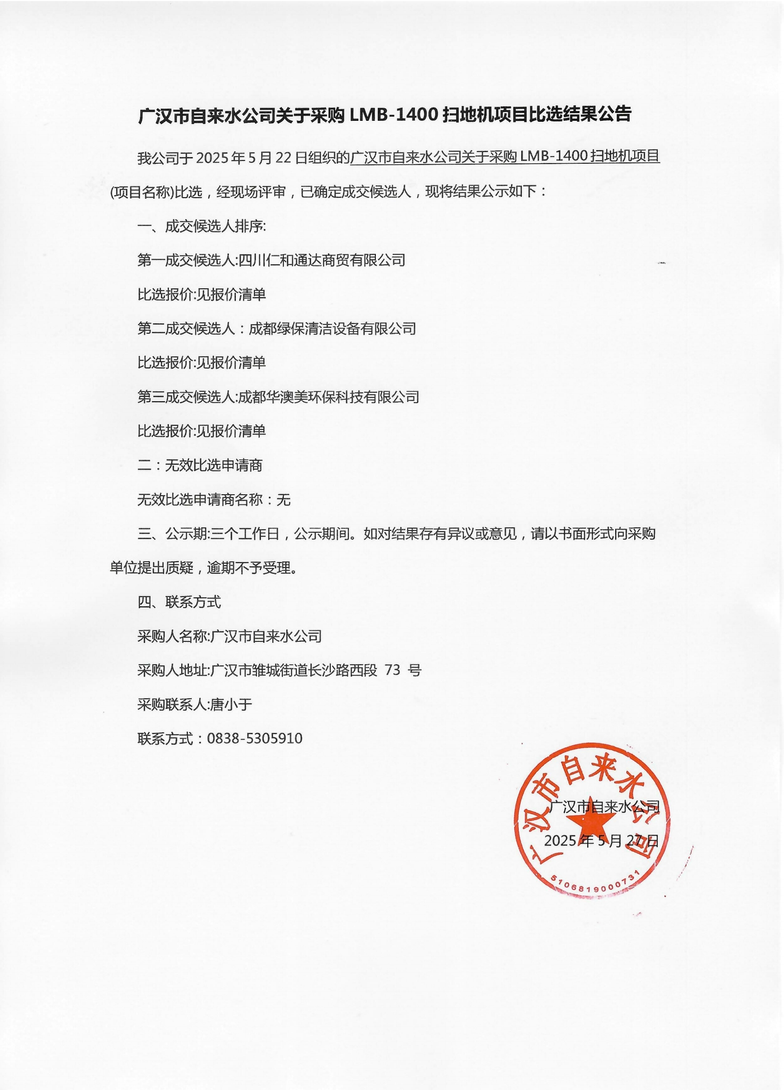广汉市自来水公司关于采购LMB-1400扫地机项目比选结果公告