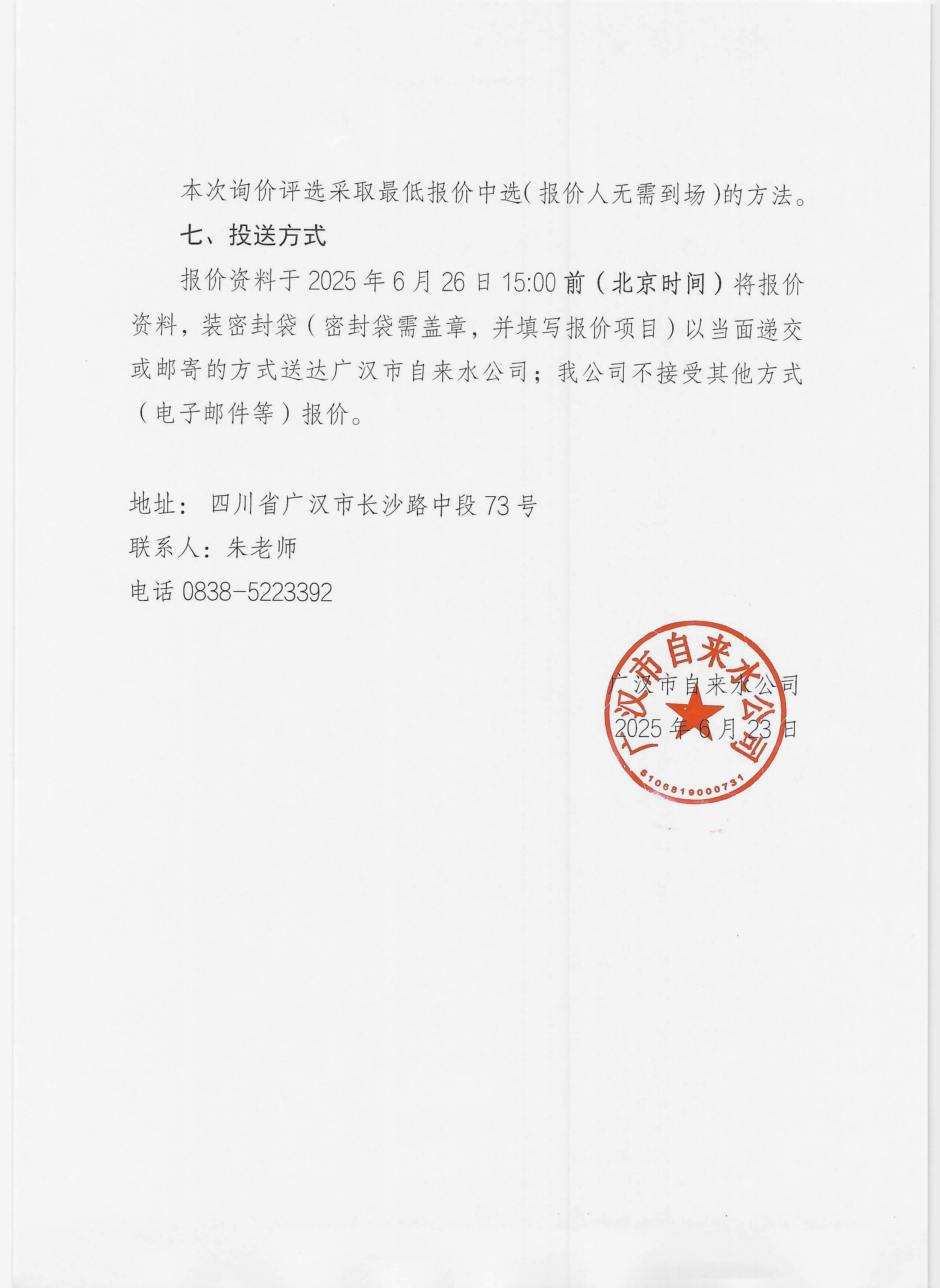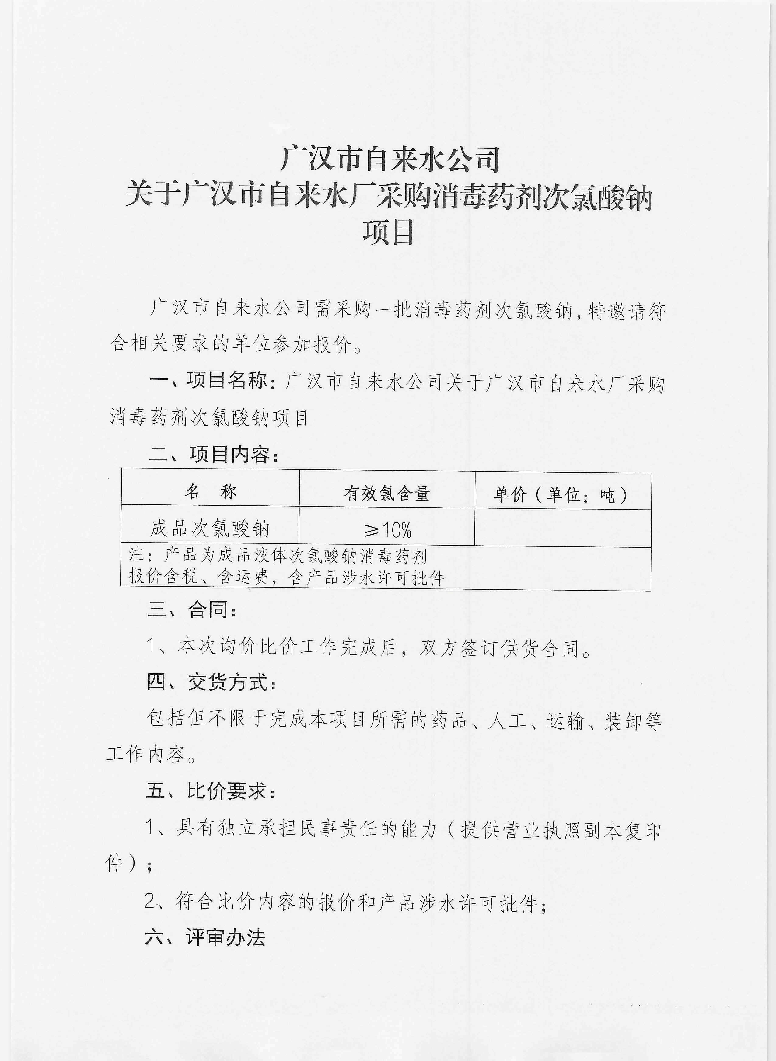 广汉市自来水公司关于广汉市自来水厂采购消毒药剂次氯酸钠项目