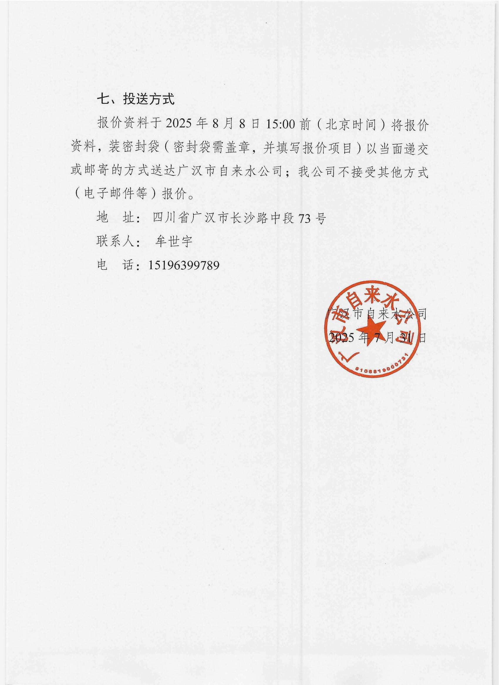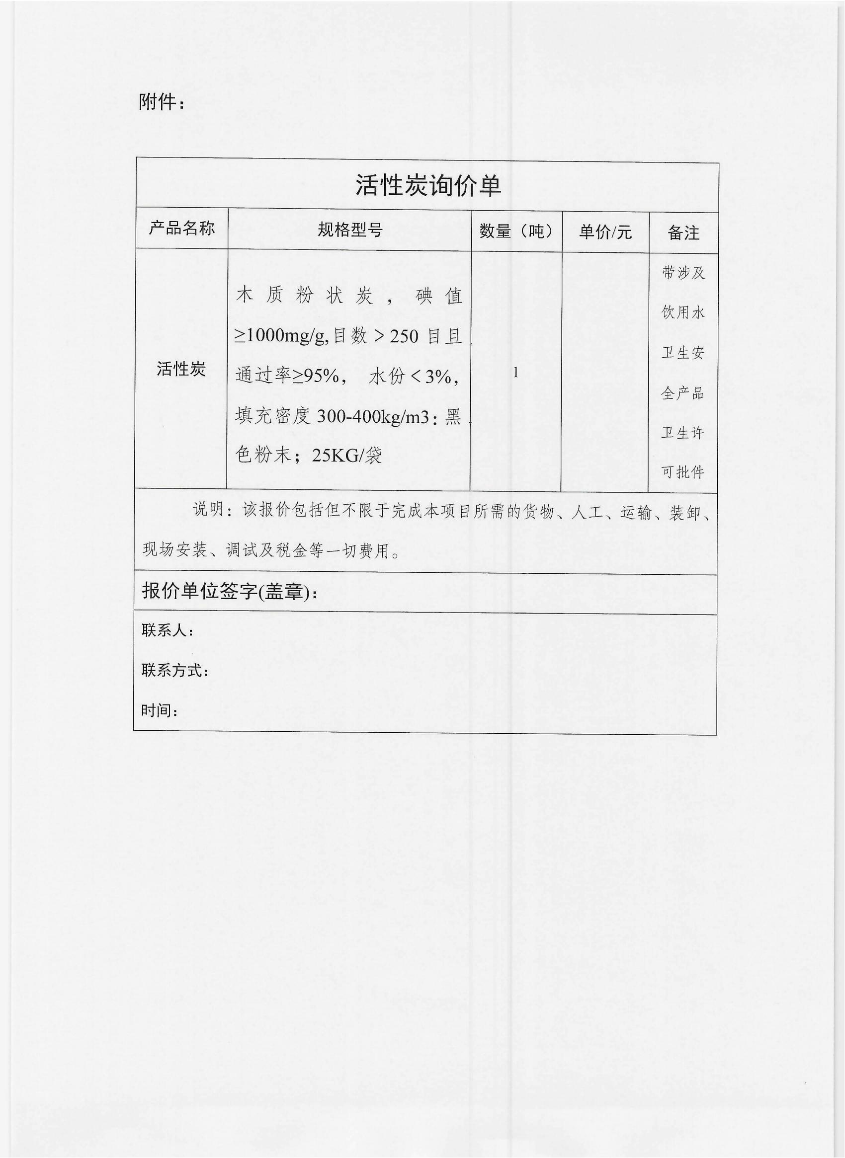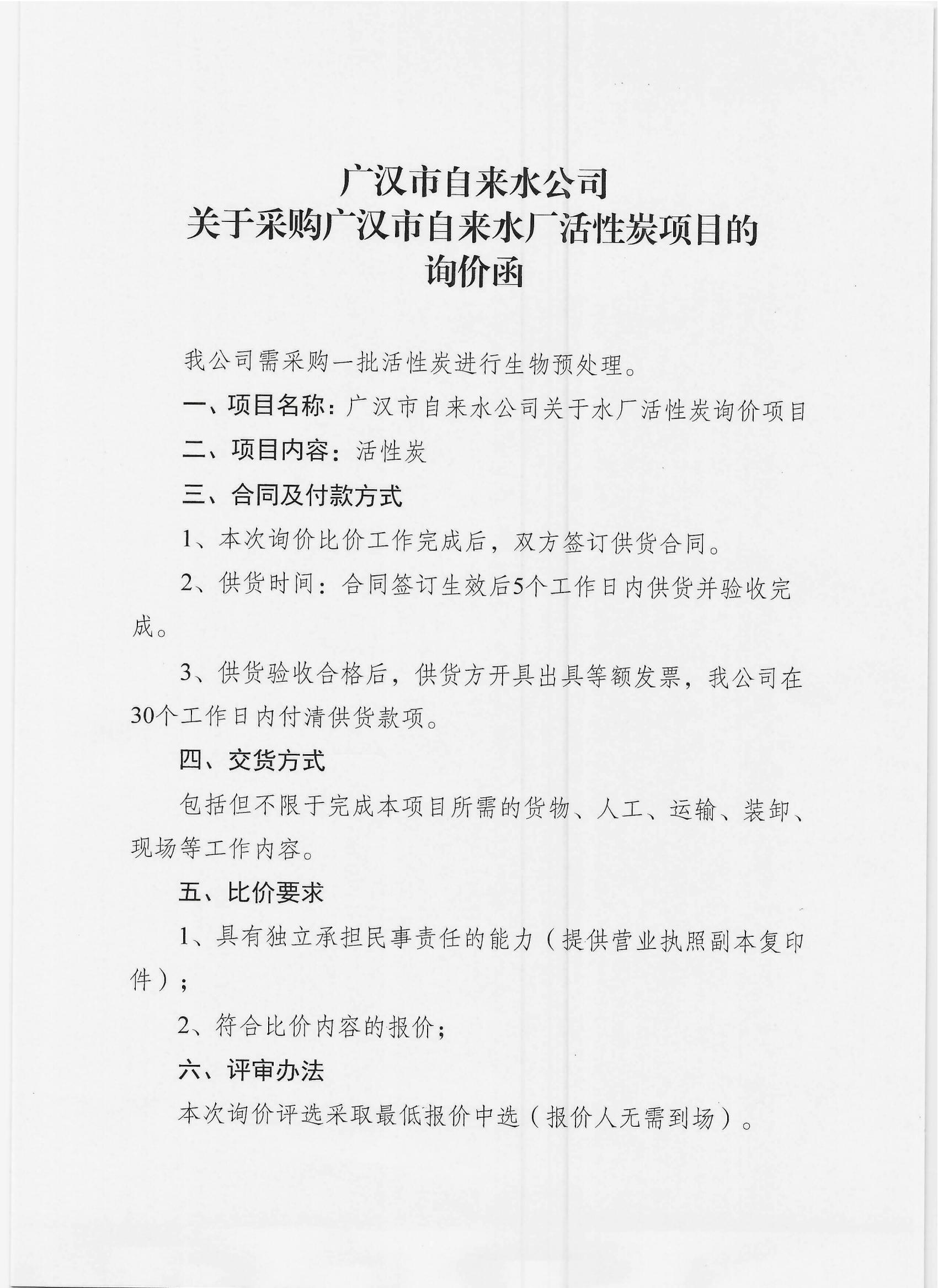 广汉市自来水公司关于采购广汉市自来水厂活性炭项目的询价函