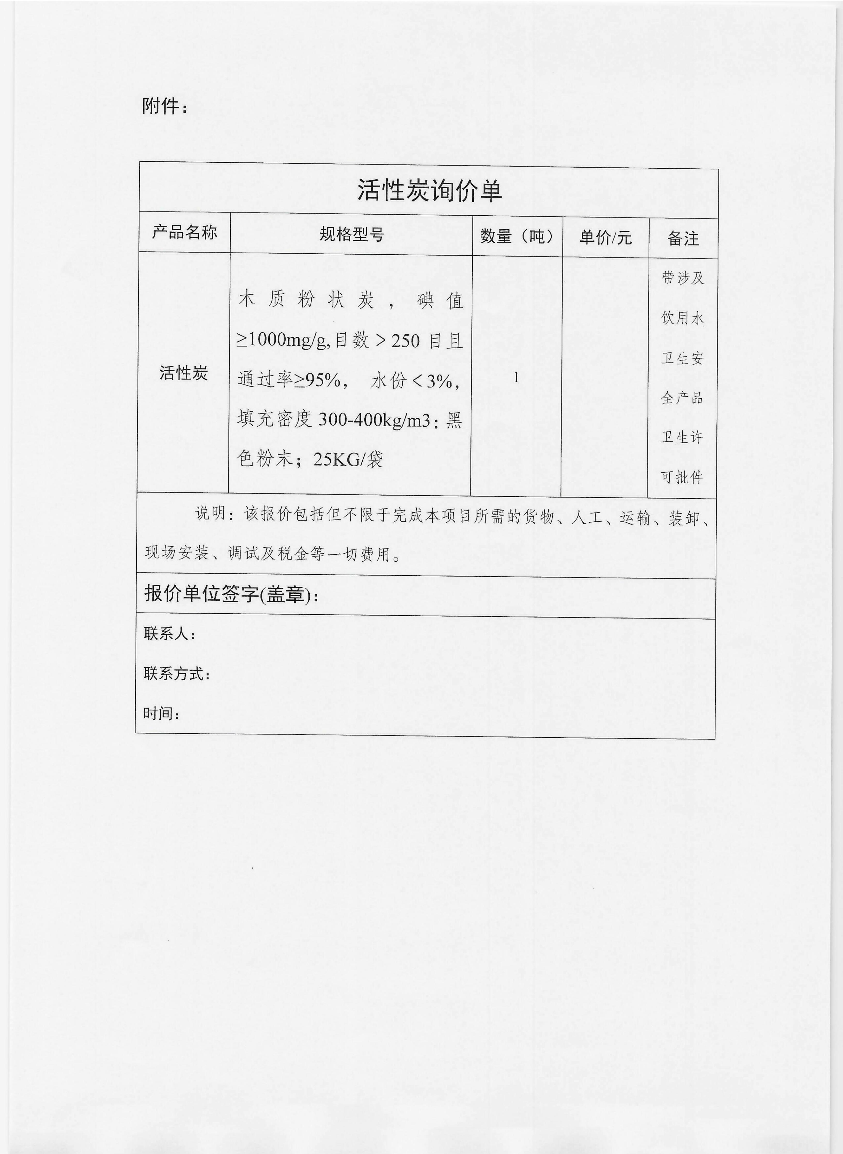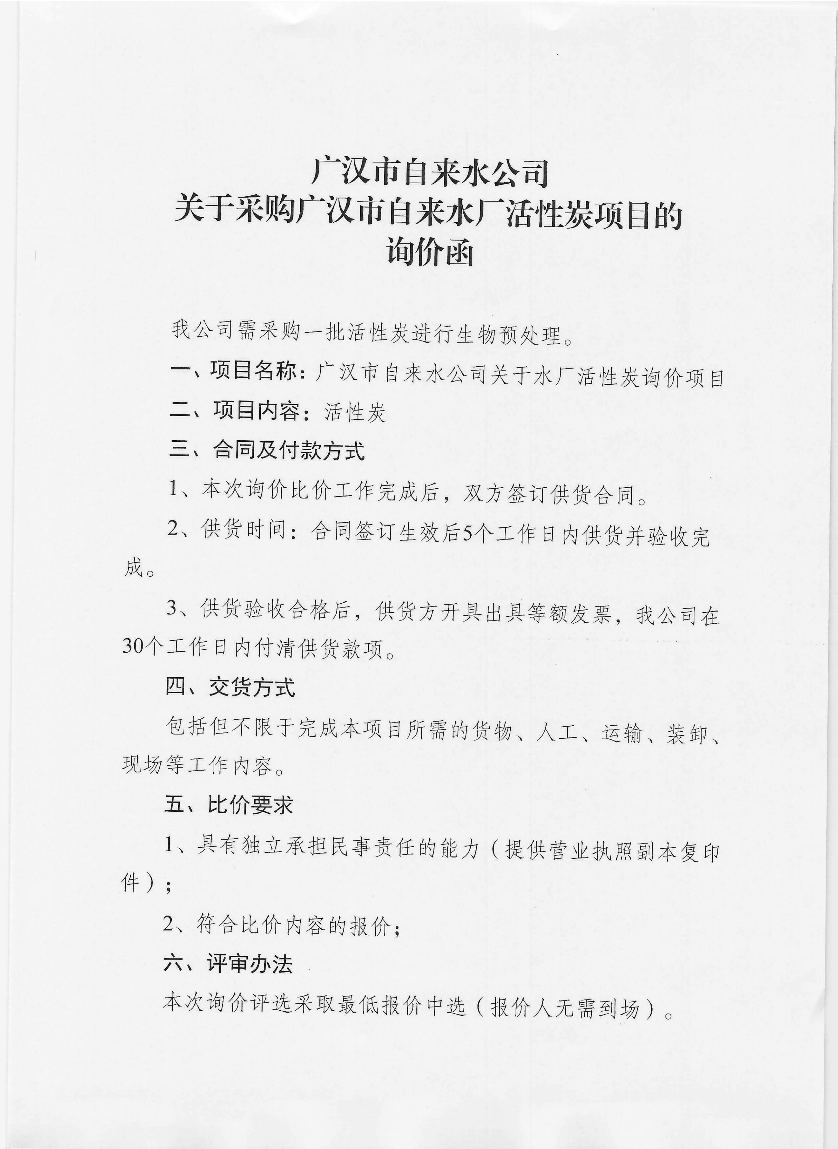广汉市自来水公司关于采购广汉市自来水厂活性炭项目的询价函