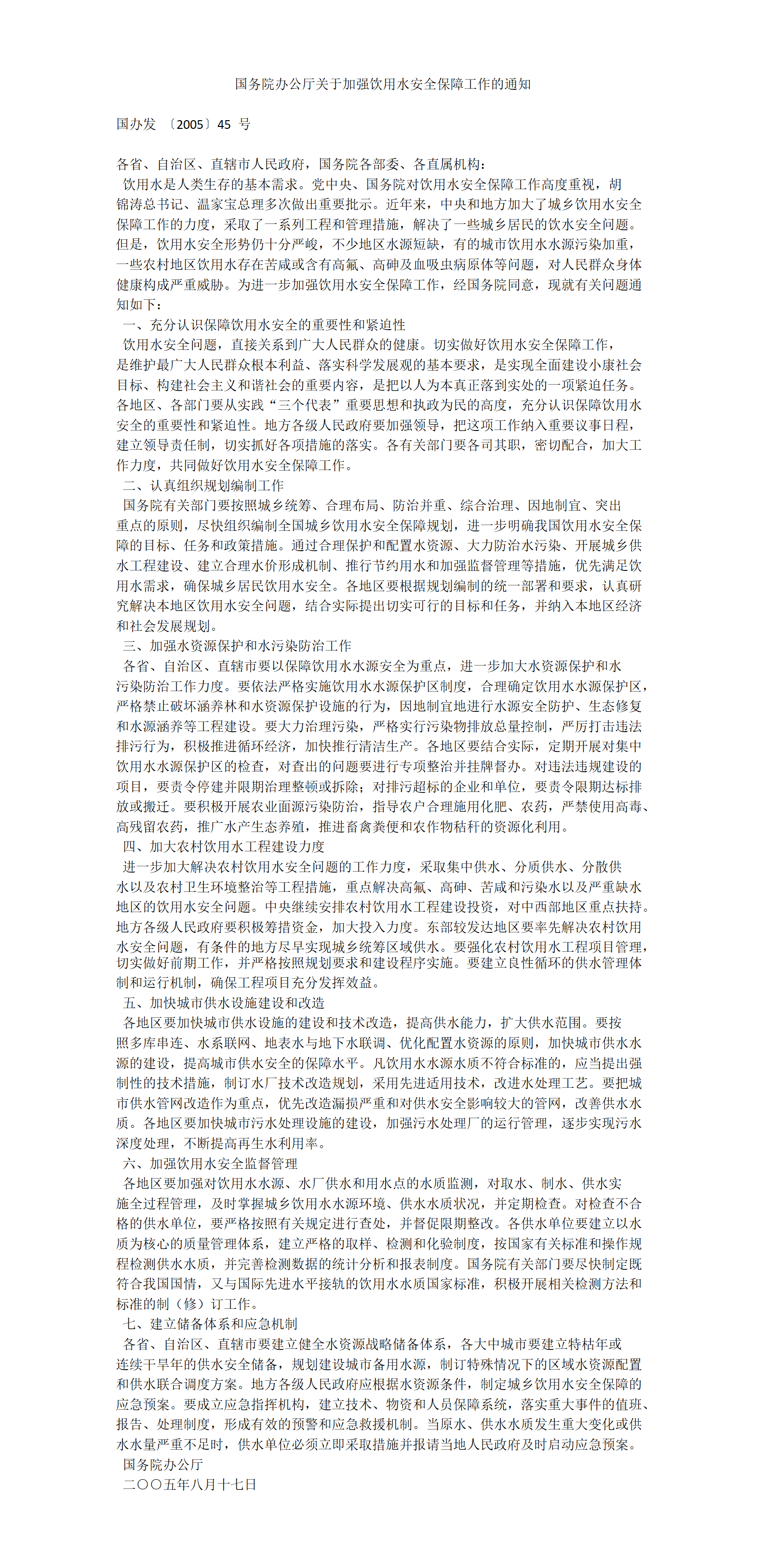 国务院办公厅关于加强饮用水安全保障工作的通知