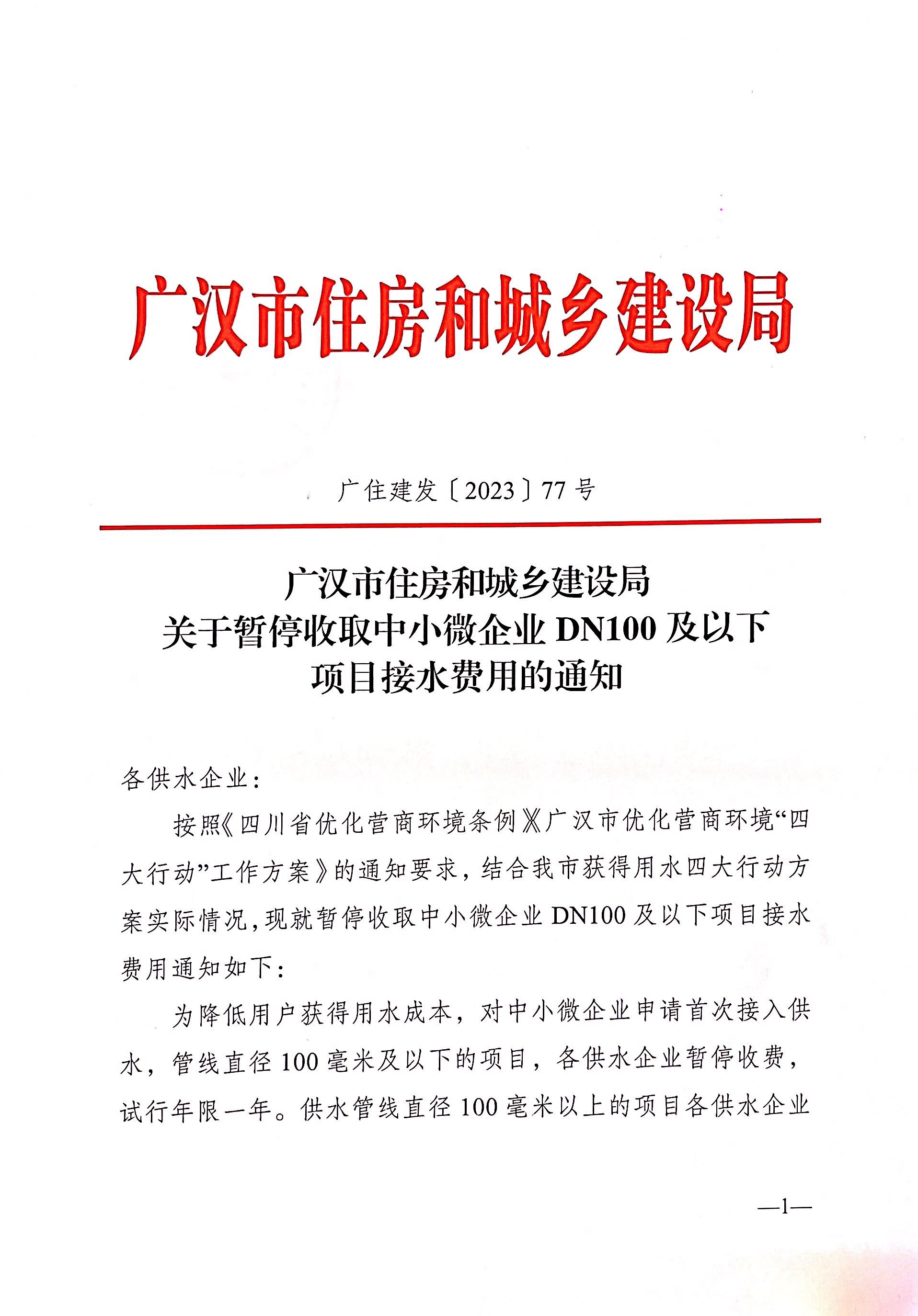 关于暂停收取中小微企业DN100 及以下项目接水费用的通知
